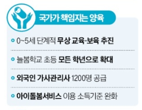 양육 정책으로는 국가가 양육을 책임지는 퍼블릭 케어로 전환 (0~11세 까지 국가 책임주의 완성 목표)